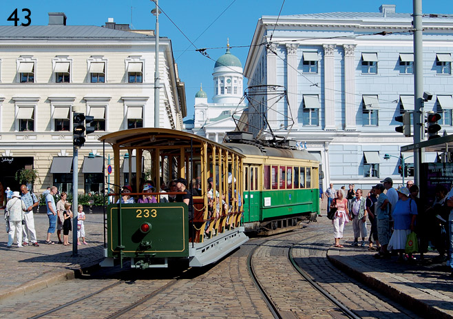 Helsingfors: ASEAs tvåaxliga motorvagn 157 från år 1930 och sommarsläpvagnen 233 (Sandvikens skeppsdocka) från år 1919 (renoverad 2009) på Salutorget. Fotograferad 8/09.